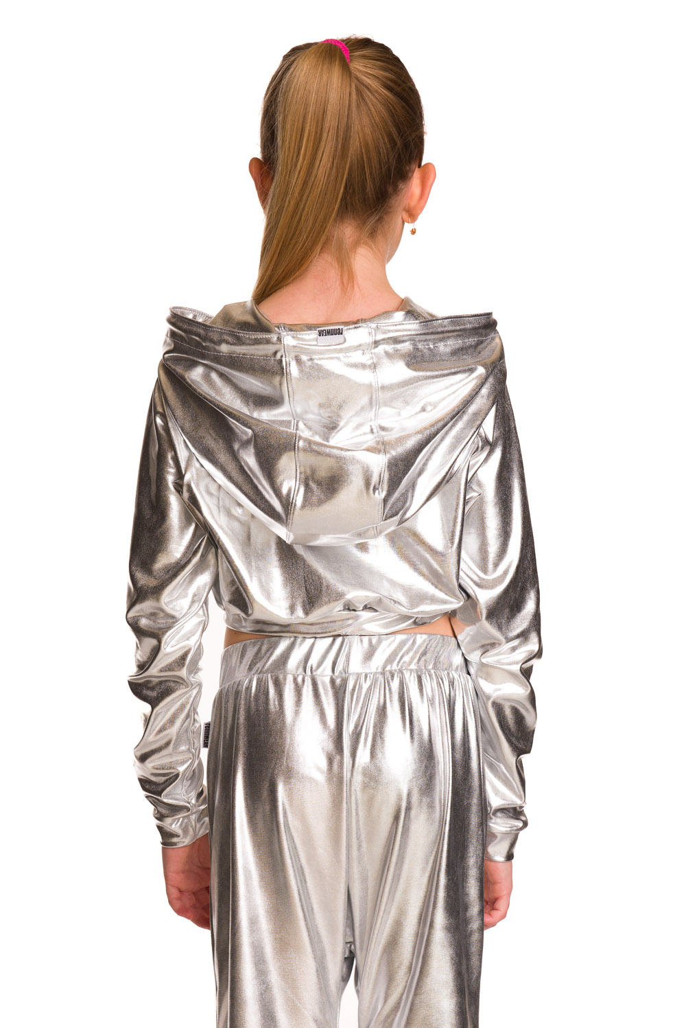 Vaikiški metaliniai blizgantys megztiniai su dideliu gobtuvu spektakliams sidabriniai